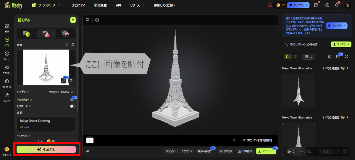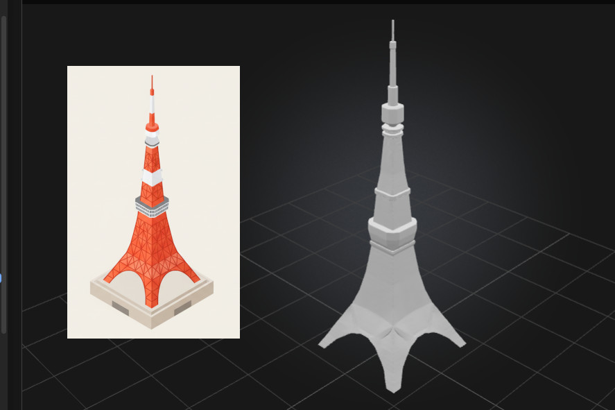早速、先ほどの東京タワーの3Dモデルを生成してみます。