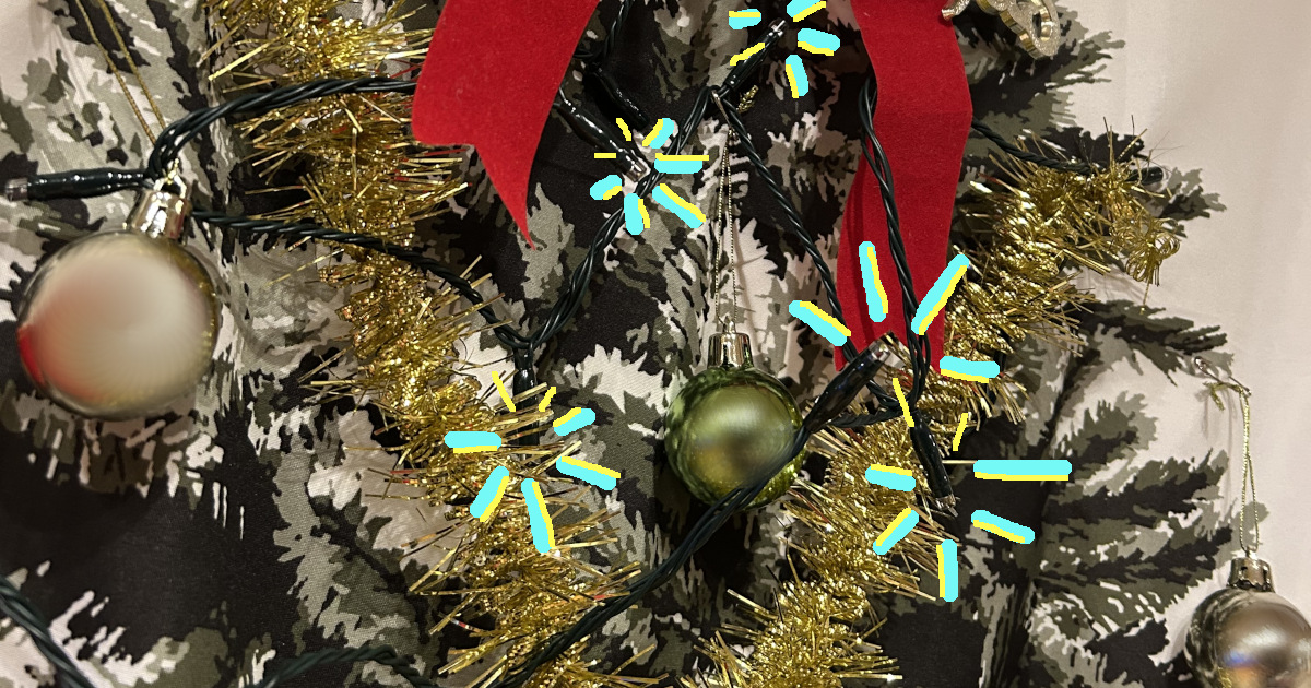 ライトはグルグル巻きつけることはできないため、安全ピンで付いているオーナメントに引っかけながらバランスよく取り付けます。