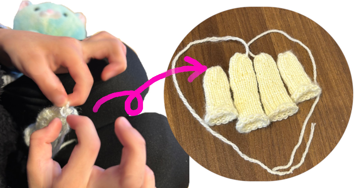 編み器具を子供に渡すと、隣で見ていたのですぐに編み進めています。(私より早くて上手)