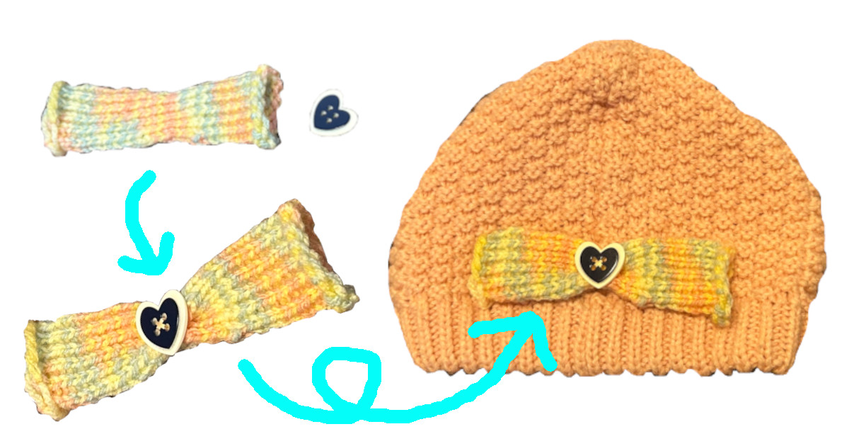 中央をつまんでリボンにしたら帽子に縫い付けます。
